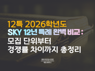 경희대학교의 변화는 12년 특례 전형의 평가를 더욱 심층적으로 만들겠다는 의도로 해석된다. 면접 100%의 정성평가에 자기소개서라는 서사를 더해 지원자의 잠재력과 전공 적합성을 다각도로 검증하려는 시도다. 3년 특례 지원자는 여전히 필답고사 성적이 당락을 결정하는 핵심이므로 시험 준비에 집중해야 하며, 12년 특례 지원자는 면접 준비와 더불어 자신의 강점을 드러낼 수 있는 자기소개서 작성에 공을 들여야 한다.