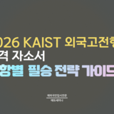 - 공지 국내대 2026 KAIST 외국고전형 합격 자소서: 문항별 필승 전략 가이드 전략적으로 풀어보는 26 KAIST 외국고전형 자소서 작성법카이스트 외국고전형 원서 접수가 시작되었습니다.카이스트는 외국인전형을 제외하면 특례전형이 없으므로 해외고 출신, 특례 전...
