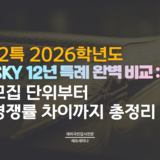 - 공지 국내대 (12특)2026학년도 SKY 12년 특례 완벽 비교: 모집 단위부터 경쟁률 차이까지 총정리 서울대학교·연세대학교·고려대학교전교육과정해외이수자특별전형(12년 특례)전후기 모집 심층 비교 분석 본 칼럼은 2026학년도 입시 혹은 향후 입시를 준비하는...
